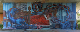 Violant, debout à l'extrême droite de la photographie, donne l'échelle de sa fresque. Est-ce encore une fresque ou un mur peint? La définition est, en fait, de peu d'importance. La profonde originalité de Violant est de peindre ce qu'il a envie de peindre sans se soucier des canons et des codes du street art. À se demander si ses œuvres sont des fresques de street art. Peu importe. Dans "Insomnie", Violant peint une scène intime : une femme ne dort pas. elle est seule dans une chambre et est assaillie par un monstre qui prend la forme d'un dragon qui la menace ou essaie de la pénétrer. Le décor évoque une chambre d'adulte mais un ours en peluche est au bas du lit. Une mère donc ne dort pas et, dans cette chambre ordinaire, un monstre extraordinaire tente de l'envahir. La scène de l'insomnie qui pourrait être une scène banale devient une scène d'épouvante.